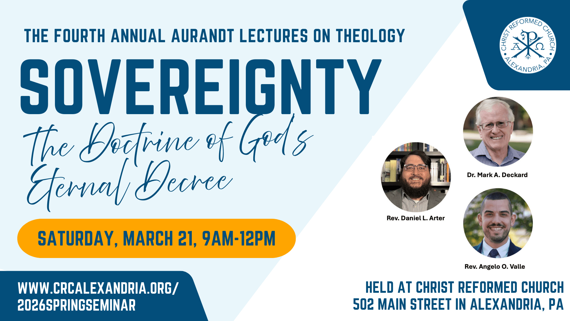 Christ Reformed Church, 502 Main Street in Alexandria, Pennsylvania, invites you to join us for the Fourth Annual Aurandt Lectures on Theology. On Saturday, March 21st at 9am, we will consider the Sovereignty of God in the Eternal Decree of God. How should a Christian today understand the reality of God’s sovereign will over all things and human responsibility in the world? Rev. Daniel L. Arter, Dr. Mark A. Deckard, and Rev. Angelo O. Valle will come together to provide insight on answering the beautiful harmony of the eternal decrees of God.