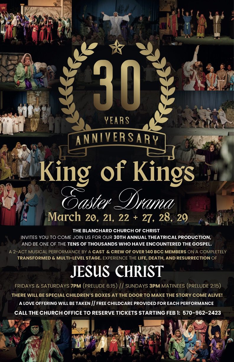 Our 30th anniversary of the King of Kings Easter Drama. Depicting the life, death and resurrection of Jesus Christ. For FREE tickets call 570-962-2423. March 20, 21, 22, 27, 28, 29th. Prelude for Friday & Saturday nights begin at 6:15 pm, and show beginning at 7:00 pm. Sunday Matinee’s prelude begins at 2:15 pm and the show begins 3:00 pm.