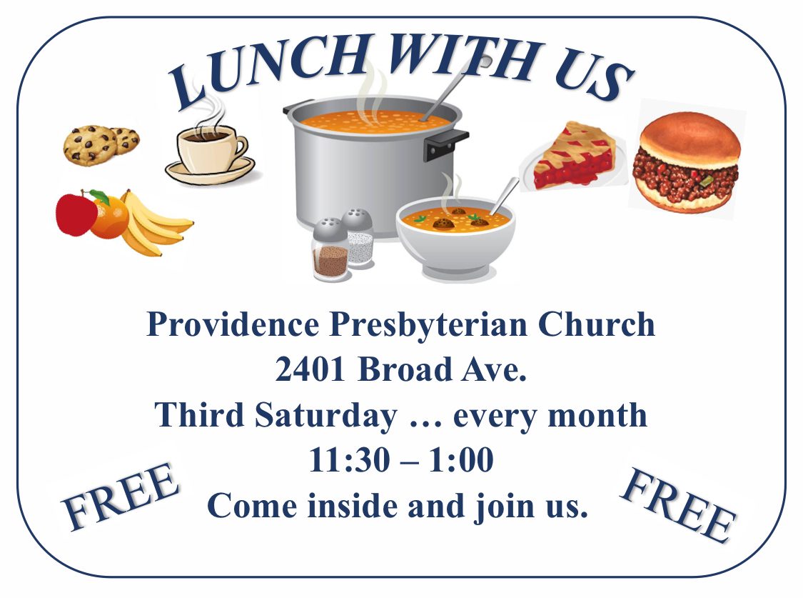 Providence Presbyterian Church at 2401 Broad Avenue, Altoona, invites the public to come to our Church for a FREE Lunch on Saturday March 21st from 11:30 AM to 1:00 PM. Lunch will include a Ham Barbeque sandwich on a bun, a variety of home-made soups, desserts, fruit and beverages. All are welcome at our Church, so come in and eat in our Social Hall and fellowship with others. Have a Blessed Day