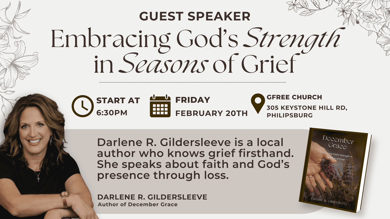 Join us at gFree Church in Philipsburg on Friday February 20 at 6:30pm to hear Darlene Gildersleeve share her personal story of Embracing God’s Strength in Seasons of Grief. Everyone is welcome to attend.
